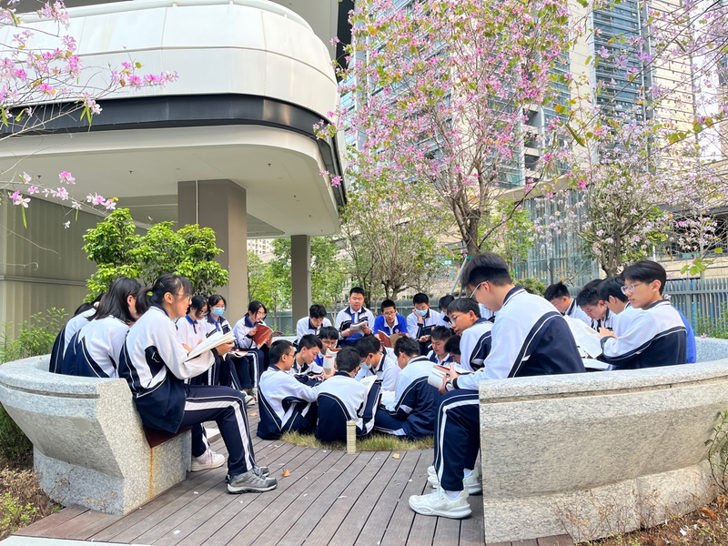 ▲深圳市格致中学学生在花树下晨读。