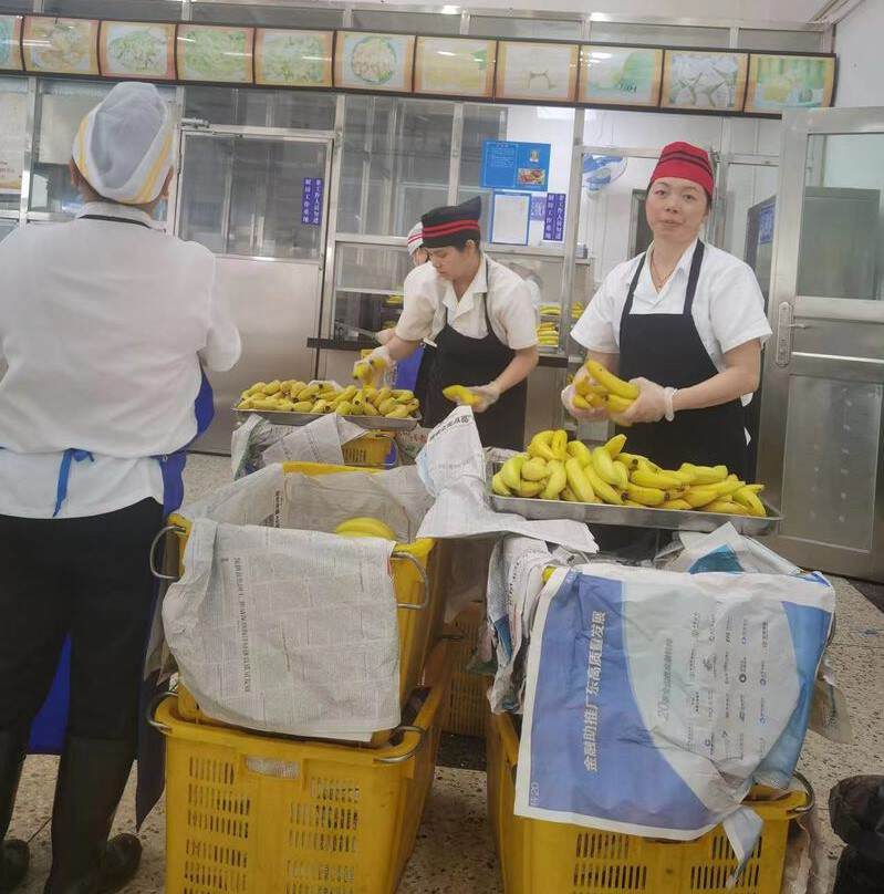 ▲深圳市第二实验学校的饭堂阿姨为考生准备水果。