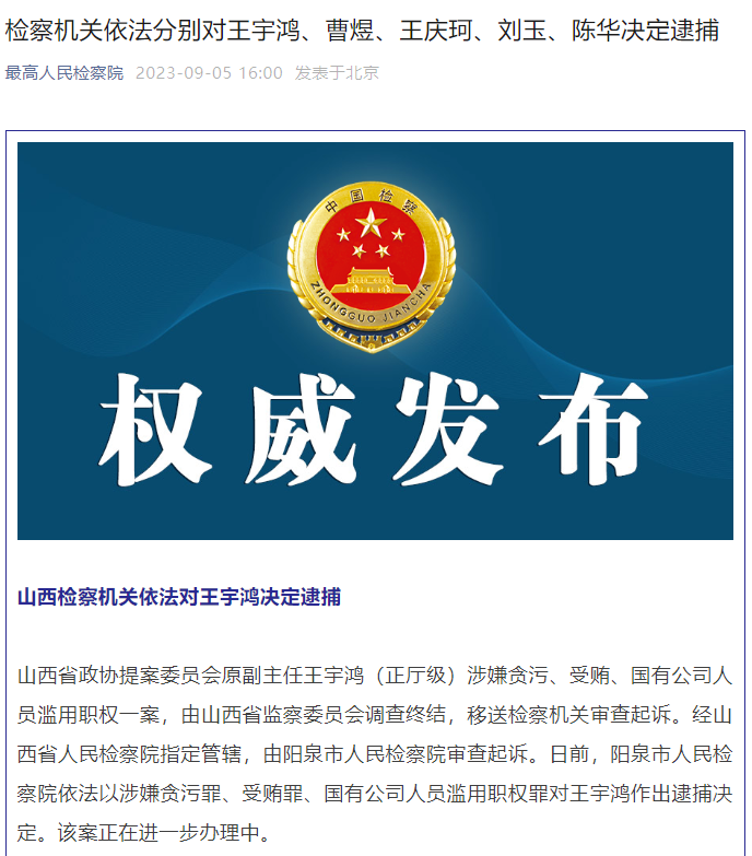山西检察机关依法对王宇鸿决定逮捕