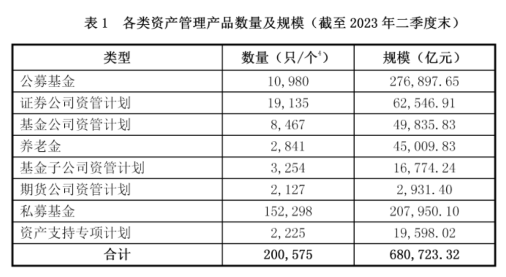 其中,公募基金规模27.69万亿元,证券公司及其子公司私募资产管理业务规模6.25万亿元,基金管理公司及其子公司私募资产管理业务规模6.66万亿元,基金公司管理的养老金规模4.50万亿元,期货公司及其子公司私募资产管理业务规模2931.40亿元,私募基金规模20.80万亿元,资产支持专项计划规模1.96万亿元。