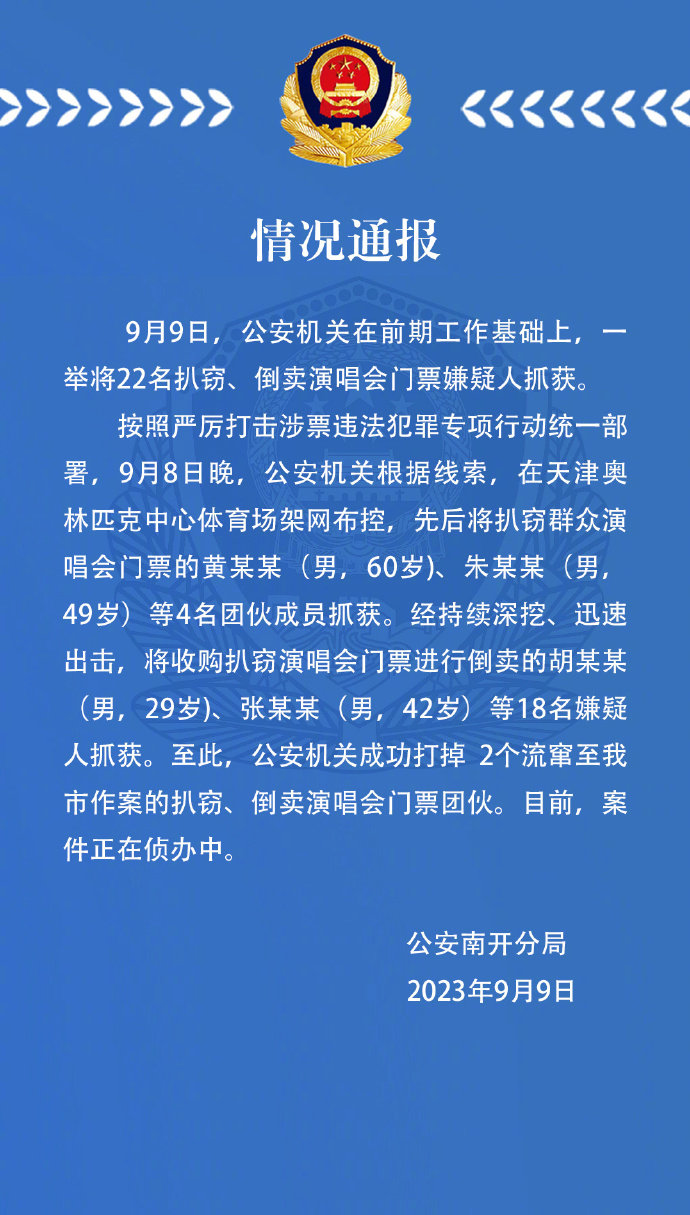 据@平安南开 通报,22名倒卖周杰伦演唱会门票黄牛在天津被抓,通报全文如下: