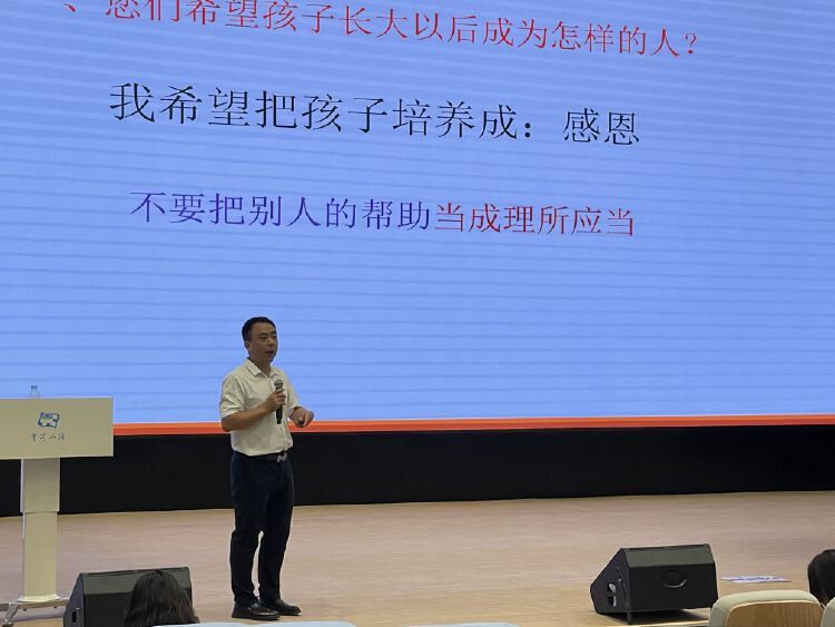 申军鸣老师用“培养什么人?怎样培养人?为谁培养人?”三个问句抛砖引玉,激荡了家长们的思考。他认为,健康、孝顺、善良、感恩、正气、主见,这些中国传统文化中最朴素的品质,如今却成了稀缺品,而他就是要让孩子成为这样的人。