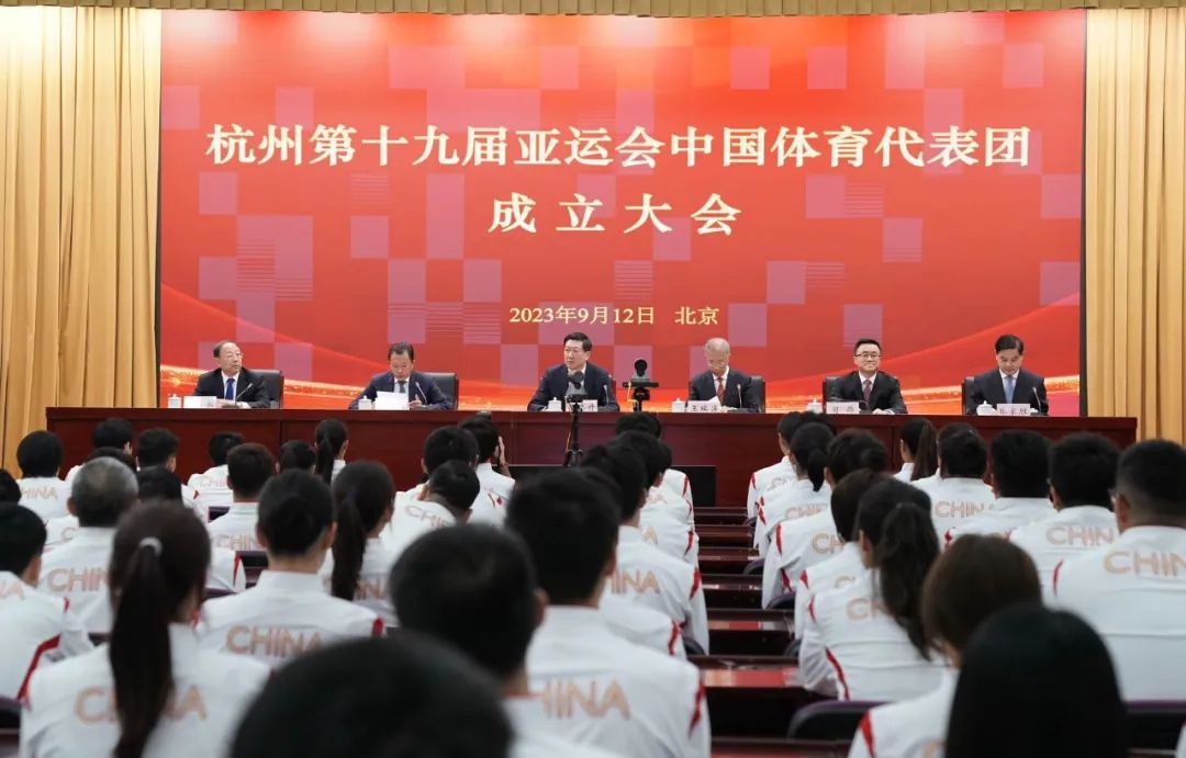 9月12日,第十九届亚运会中国体育代表团成立大会在北京举行。代表团团长、体育总局局长、党组书记高志丹出席会议并作动员讲话。杭州亚运会中国体育代表团总人数1329人,其中运动员886人(女运动员437人,男运动员449人),包括36名奥运会冠军,630人为首次参加亚运会。