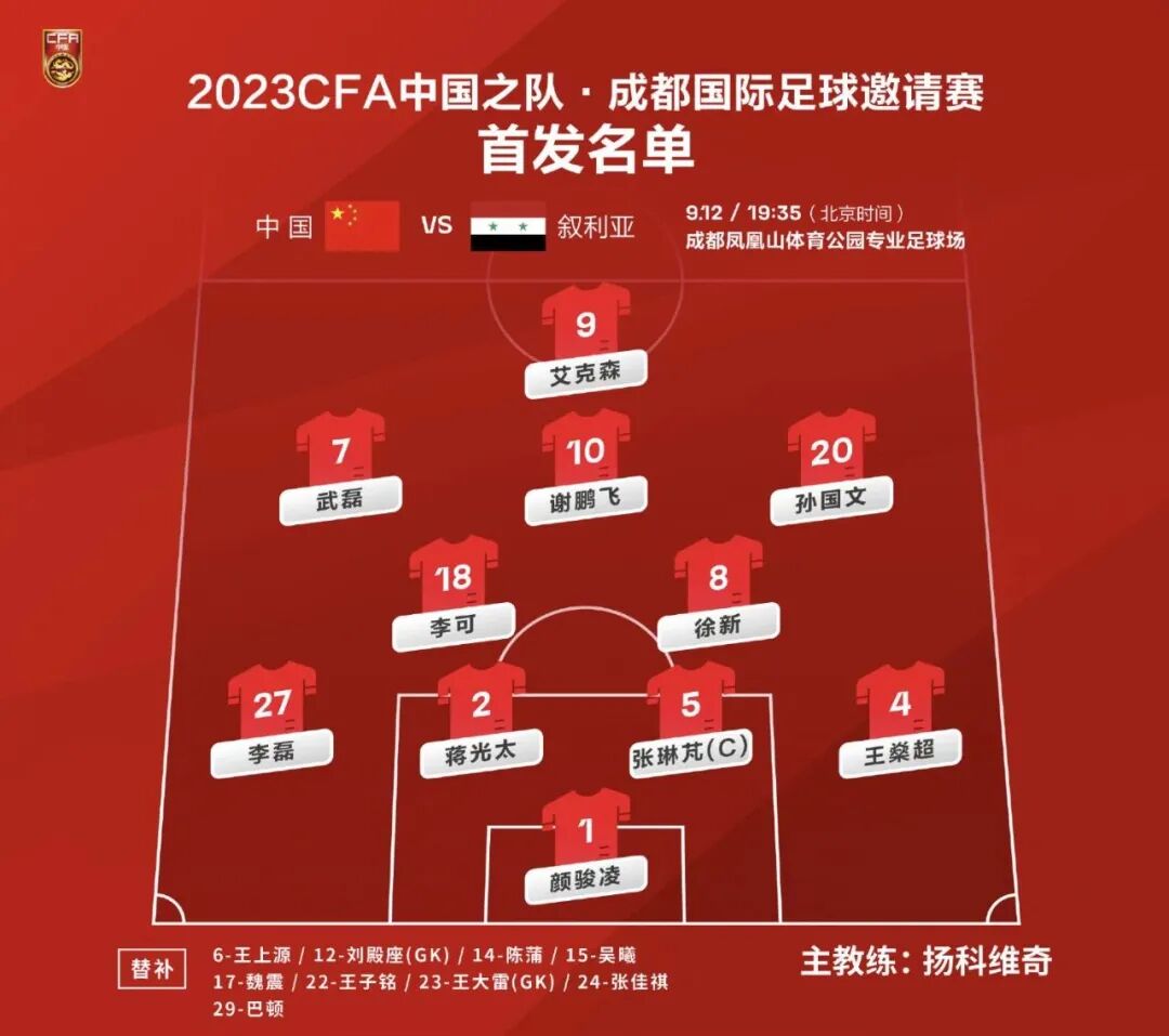 徐新顶替吴曦出任首发,搭档李可。上一场替补登场有着不错发挥的谢鹏飞担任首发。后防线上,王燊超、蒋光太和张琳芃这上海海港三人组搭配两个边翼卫李磊和孙国文。