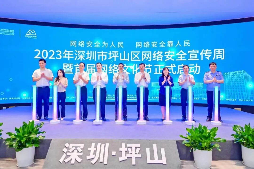 9月13日,2023年深圳市坪山区网络安全宣传周暨首届网络文化节在创新广场东部之芯启动,深圳市委宣传部副部长、市委网信办主任王楚宏,坪山区委常委、宣传部部长徐兴家,市委网信办、区直各单位、各街道相关负责人及央省市各级媒体和坪山在地自媒体代表,以及比亚迪汽车工业有限公司、萝卜运力(深圳)科技有限公司、奇安信集团、深圳安途智驾科技有限公司、深圳齐心集团股份有限公司、深圳荣耀智能机器有限公司、深圳市安络科技有限公司、深圳市鸿合创新信息技术有限责任公司、深圳新宙邦科技股份有限公司、中芯国际集成电路制造(深圳)有限公司、百度国际科技(深圳)有限公司、拉普拉斯新能源科技股份有限公司等重点企业相关负责人出席。