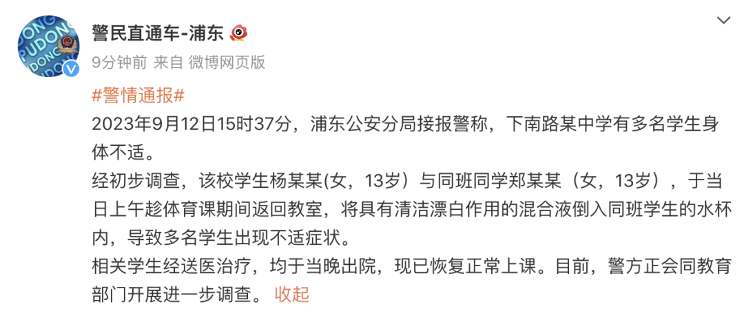 (原标题《上海有中学生在校投放不明物质致同学饮用后送医?有关部门已在调查》)