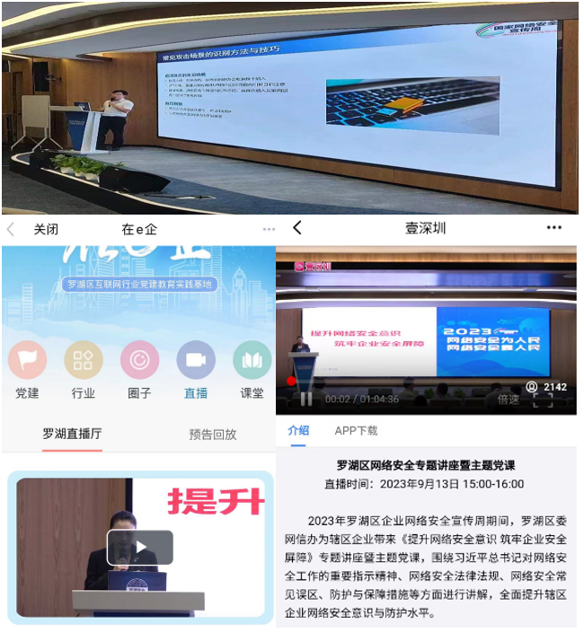 3.罗湖区企业网络安全宣传周及主题党课。举办企业网络安全主题展、专题讲座暨主题党课,发出企业网络安全倡议,倡导辖区企业共同重视和加强网络安全防护。