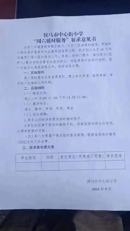 此外,侯马市中心街小学也给家长下发了内容基本相同的“‘周六延时服务’征求意见书”。据悉,学校从一年级到六年级均有“周六加课”。