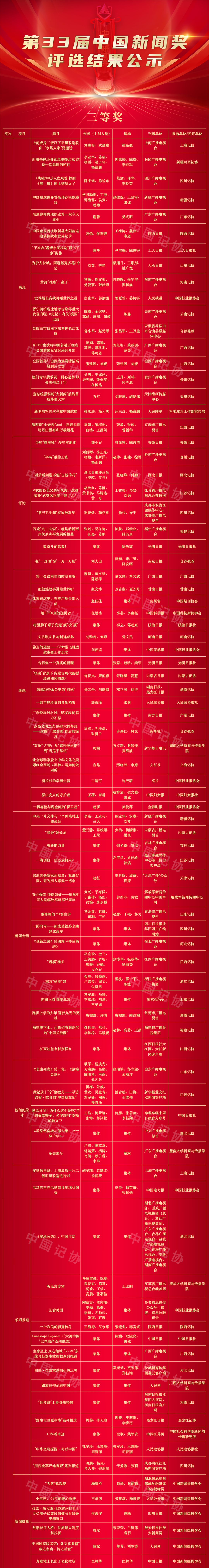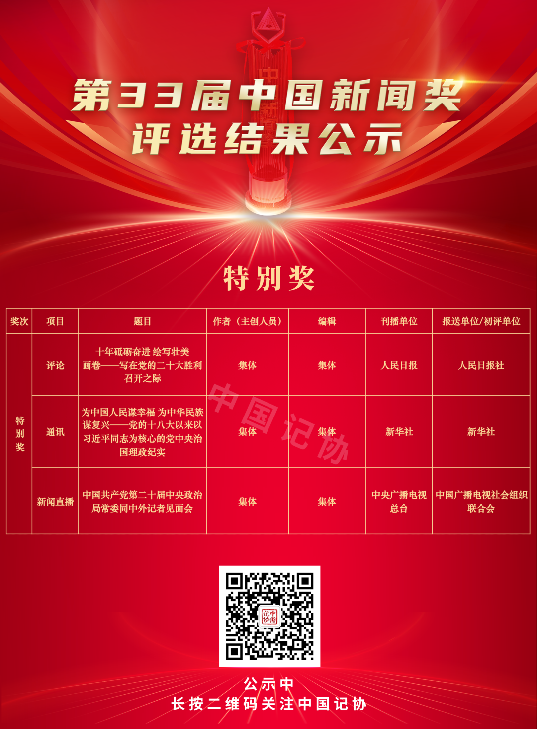 9月20日,“中国记协”微信公众号发布《关于公示第33届中国新闻奖评选结果的公告》,全文如下: