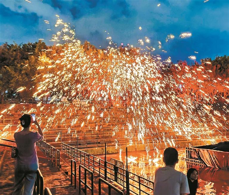 ▲龙华区观澜湖生态运动公社景区表演区的非遗“打铁花”表演吸引市民驻足观赏。