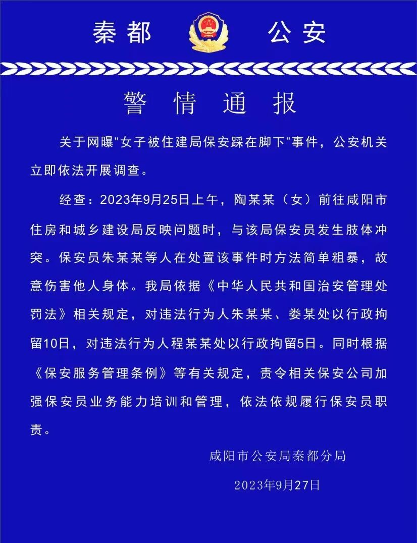 关于网曝"女子被住建局保安踩在脚下"事件,27日,陕西省咸阳市公安局秦都分局微信公众号发布警情通报: