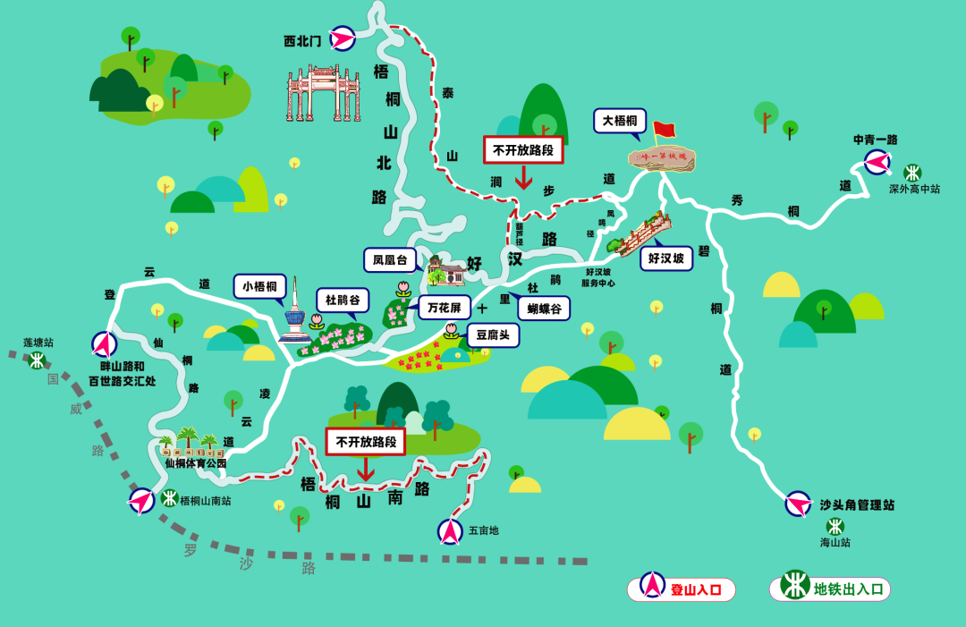 梧桐山风景区定于9月28日起开园,泰山涧全路段、梧桐山南路东方尊峪后门至五亩地路段暂不开放。