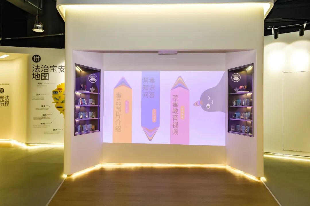 基地内设展示大厅、宣教科普馆、多媒体法治教室等区域。综合运用“VR虚拟现实、手势识别、全息互动、3D人机交互”等科技,构建了“数字化+自主化”交互式直观学习环境,能够达到寓教于乐的普法宣传效果。基地开放以来,迎接了来自省、市多个单位的参观调研,先后与深圳外国语学校龙华学校、玉龙学校、深圳高级中学(集团)北校区等中小学校建立禁毒宣教互动机制,并接受辖区上万群众的预约参观,获得了社会各界一致好评。