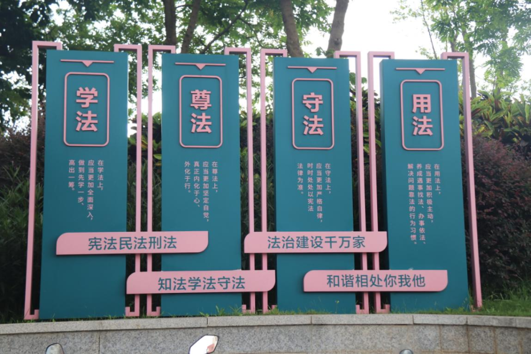 公园以“法”为核心要素,秉持“融法于景、因地制宜”的理念,在不改变原有景观设计的前提下,将“法”“景”融合进法治文化阵地,注入大量的法治文化元素。