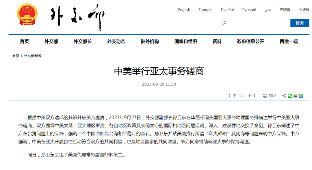 据外交部网站29日消息,根据中美双方达成的共识并应美方邀请,2023年9月27日,外交部副部长孙卫东在华盛顿同美国亚太事务助理国务卿康达举行中美亚太事务磋商。双方围绕中美关系、亚太地区形势、各自地区政策及共同关心的国际和地区问题坦诚、深入、建设性地交换了意见。孙卫东阐述了中方在台湾问题上的立场,强调一个中国原则是台海和平稳定的基石。孙卫东并就美国推行所谓“印太战略”及南海等问题表明中方立场。中方强调,中美在亚太开展良性互动符合双方的共同利益,也是地区国家的共同愿望。双方同意继续就亚太事务保持沟通。
