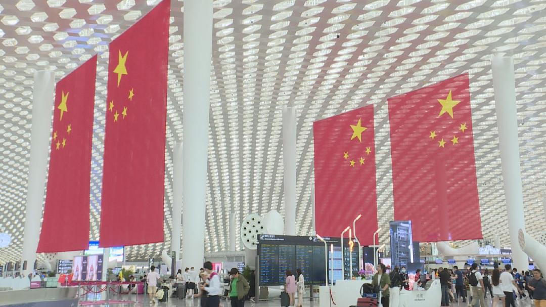 一进入深圳宝安国际机场航站楼出发大厅,映入眼帘的就是四面超大的国旗,旅客们纷纷拿出手机,拍照、合影。