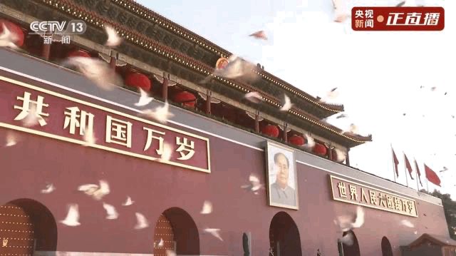6点10分,国旗升至旗杆顶端,万羽和平鸽翱翔天空,绕着广场盘旋。