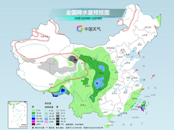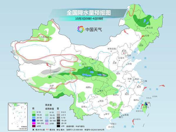 今天(10月3日)白天,华西地区降雨将有所减少、减弱,但今夜起新一轮降雨过程又将开启,部分地区有大雨,局地暴雨;同时青海、甘肃局地有暴雪或大暴雪,需注意防范。气温方面,东北地区等地未来三天将出现降温。5日至7日,南方气温也将下滑,暑热缓解。