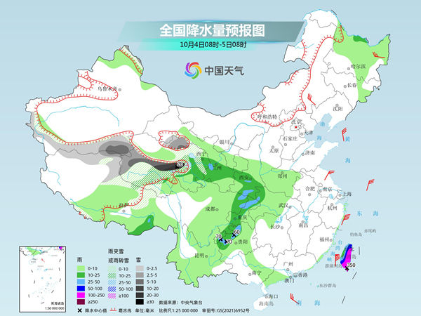 明天,新疆北疆北部和南疆盆地高海拔地区、西藏北部,青海东部和中南部、甘肃西部等地有中到大雪或雨夹雪,其中青海东南部部分地区有暴雪,局地大暴雪(20~28毫米);甘肃南部、陕西中南部、四川东北部、重庆中西部、贵州西北部、湖北西部以及台湾岛等地有中到大雨,其中贵州西北部、台湾岛中东部部分地区有暴雨或大暴雨,台湾岛东南部局地特大暴雨(250~350毫米)。