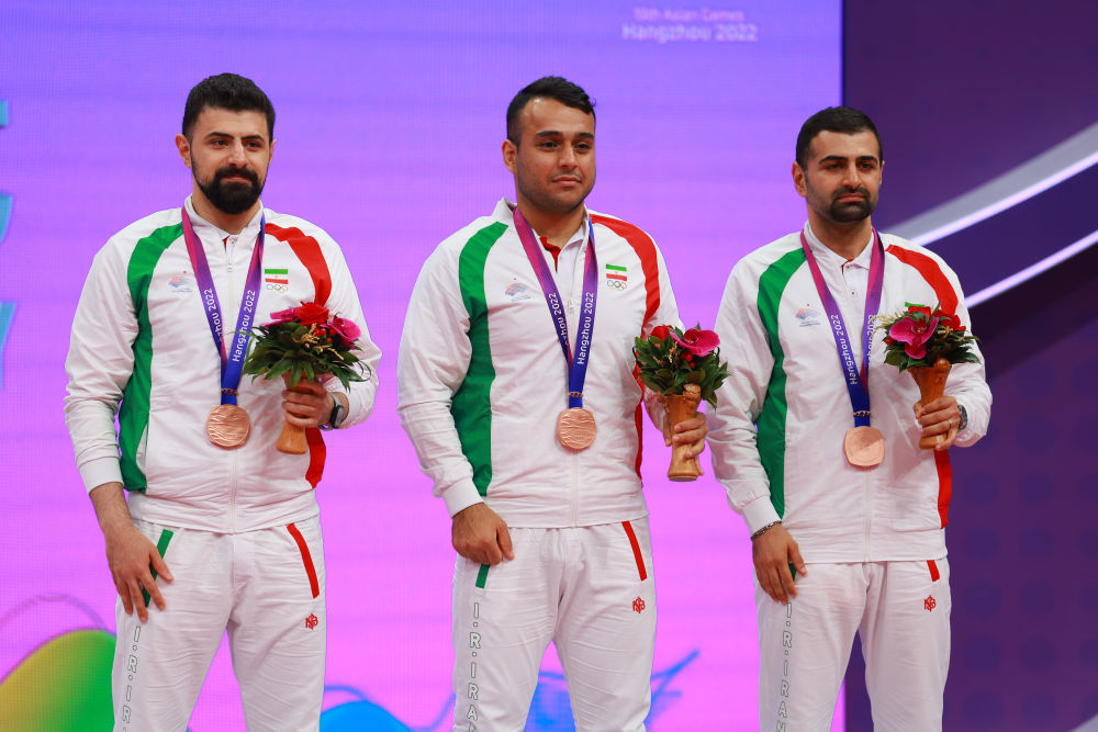 9月26日,杭州亚运会乒乓球男子团体季军伊朗队选手在领奖台上。新华社记者 刘续 摄