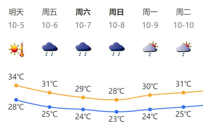 展望6-8日有(雷)阵雨,部分时间雨势较大,高温缓解,沿海、海区和高地有6-8级阵风。