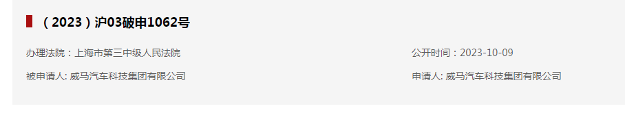 10月10日,全国企业破产重整案件信息网显示,威马汽车科技集团有限公司申请破产重整,申请人正是威马汽车自身。办理法院为上海市第三中级人民法院。