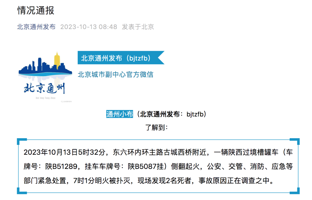 据“北京通州发布”微信公众号消息,2023年10月13日5时32分,东六环内环主路古城西桥附近,一辆陕西过境槽罐车(车牌号:陕B51289,挂车车牌号:陕B5087挂)侧翻起火,公安、交管、消防、应急等部门紧急处置,7时1分明火被扑灭,现场发现2名死者,事故原因正在调查之中。
