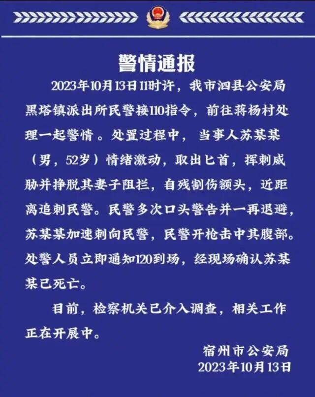 2023年10月13日11时许,我市泗县公安局黑塔镇派出所民警接110指令,前往蒋杨村处理一起警情 。处置过程中,当事人苏某某(男,52岁) 情绪激动,取出匕首,挥刺威胁并挣脱其妻子阻拦,自残割伤额头,近距离追刺民警。民警多次口头警告并一再退避,苏某某加速刺向民警,民警开枪击中其腹部。处警人员立即通知120到场,经现场确认苏某某已死亡。