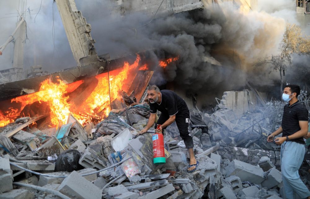 10月14日,在加沙地带南部城市汗尤尼斯,一名男子在扑灭以色列空袭造成的火灾。新华社发(亚西尔·库迪摄)