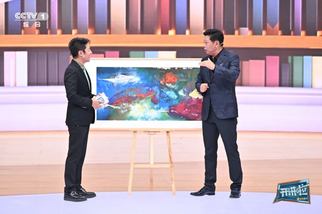 节目开场,大家就被一幅宏大深邃的抽象画《寻梦空间》吸引。曹俊先生的这幅作品局部被中国探月工程选中,跟随嫦娥5号T1飞行试验器绕月飞行。这份独属于中国人的浪漫引发了主持人小撒的想象:“万一这次飞行遇到了外太空的生命,在他看到这幅作品的一刹那,您期望传递给他的是什么?”对此,曹俊先生告诉大家,这个问题他在荷兰莱顿大学,站在爱因斯坦站过的讲台上向世界讲述中国的传统艺术时,就有一位哲学家问过同样的问题。他当时这样回答:“外星人会说,‘多美的一件作品,它来自地球人之手’,他们并没有区分是来自于西方人之手,还是我这个东方的艺术家之手,我们属于共同的家园!”