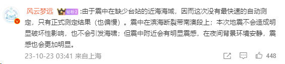 科普博主@风云梦远 表示:由于震中在缺少台站的近海海域,因而这次没有最快速的自动测定,只有正式测定结果(也偏慢)。震中在滨海断裂带南澳段上;本次地震不会造成明显破坏性影响,也不会引发海啸;但震中附近会有明显震感,在夜间背景环境安静,震感也会更加明显。