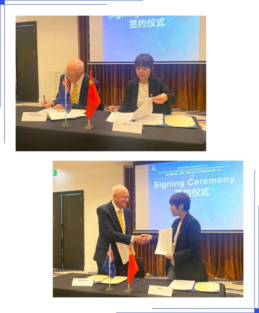 此次第二十届中国(深圳)文博会新西兰推广会由深圳市文化、广电、旅游、体育局;深圳国际文化产业博览会有限公司主办,新西兰新中投资贸易促进会、新中友好协会奥克兰分会、奥克兰国际艺术空间承协办。新中两国与会嘉宾就中国与新西兰的投资、贸易、国际交流、艺术、旅游、展会等领域进行了深度的交流与探讨,并就新西兰企业、机构参与明年中国(深圳)文博会,签订了合作备忘录。