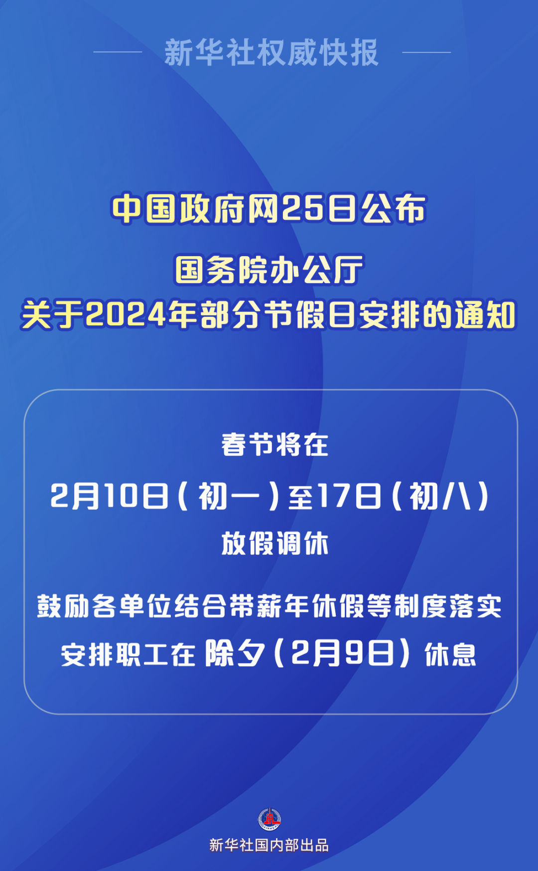 中国政府网10月25日公布《国务院办公厅关于2024年部分节假日安排的通知》。其中,春节将在2月10日(初一)至17日(初八)放假调休,2月4日(星期日)、2月18日(星期日)上班。同时,鼓励各单位结合带薪年休假等制度落实,安排职工在除夕(2月9日)休息。