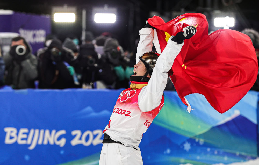 徐梦桃在张家口云顶滑雪公园举行的北京2022年冬奥会自由式滑雪女子空中技巧决赛夺冠后庆祝(2022年2月14日摄)。新华社记者 吴壮 摄