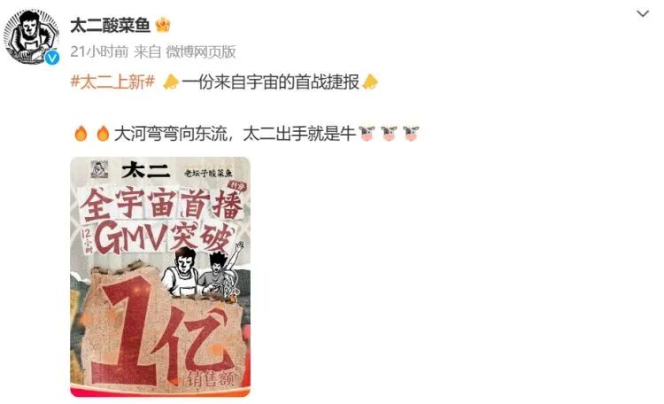 值得注意的是,就在此消息传出的前一日,太二酸菜鱼在抖音开通直播,首播12小时商品交易总额突破1亿元,其在抖音平台推出的代金券目前销量也已超2万。