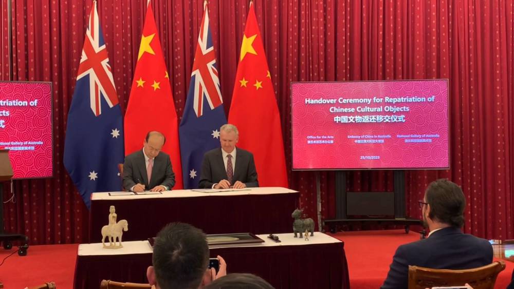 经国家文物局授权,中国驻澳大利亚大使馆25日举行仪式,接收澳方向中国返还的4件流失文物艺术品与一件古生物化石。