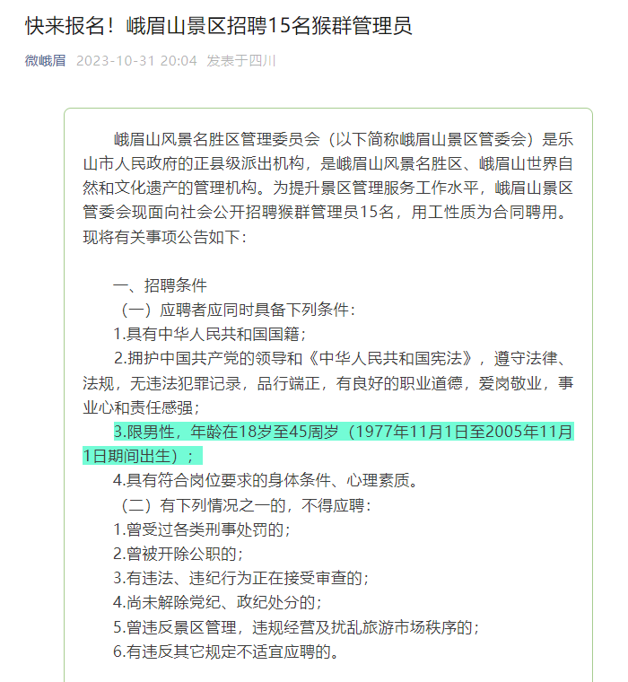 据该信息,此次招聘限男性,年龄在18岁至45周岁(1977年11月1日至2005年11月1日期间出生)。应聘者需于2023年10月31日至11月3日到峨眉山景区管委会组织和人社局报名。