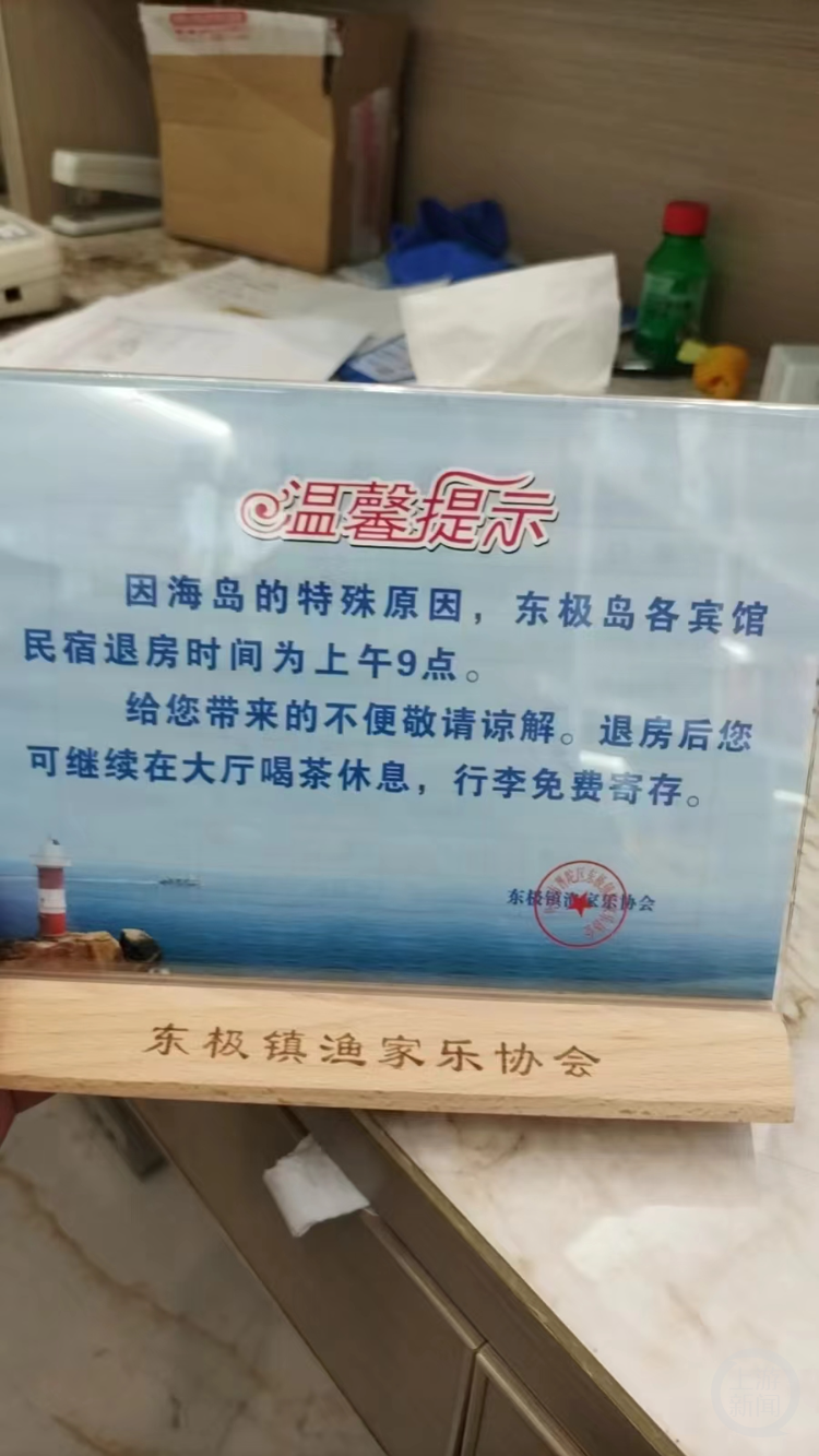 一则温馨提示写道:“因海岛的特殊原因,东极岛各宾馆民宿退房时间为上午9点。给您带来的不便敬请谅解。退房后您可继续在大厅喝茶休息,行李免费寄存。”该温馨提示右下角署名为“东极镇渔家乐协会”,并盖有公章。随后,记者联系到东极镇渔家乐协会理事会秘书长陈飘红女士,她在东极岛上也开有民宿和餐厅。据她介绍,“民宿的话,卫生阿姨没有那么多,不像城里酒店一样有空房先让客人入住,我们大都是一个房间一个户型,客人订的什么,我们就只能让他入住那个房间。”