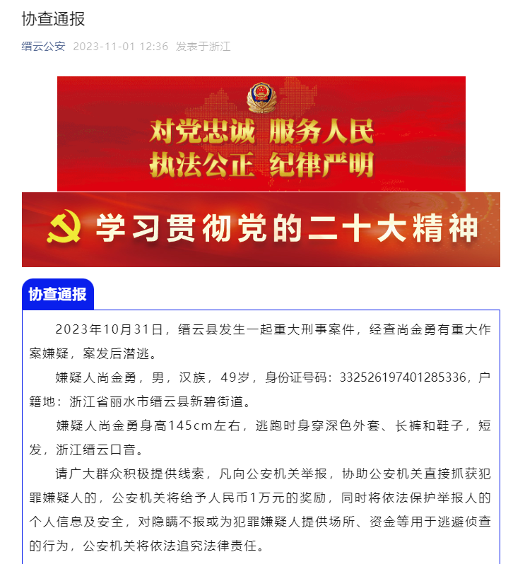11月1日,浙江省丽水市缙云警方发布协查通报:2023年10月31日,缙云县发生一起重大刑事案件,经查尚金勇有重大作案嫌疑,案发后潜逃。