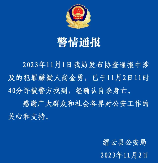 11月2日,缙云县公安局发布最新警情通报,称嫌疑人尚金勇已于11月2日11时40分许被警方找到,经确认自杀身亡。