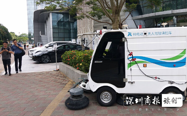 一辆具备自动驾驶功能的清洁环卫车在南山智园的开放式充电站旁工作。
