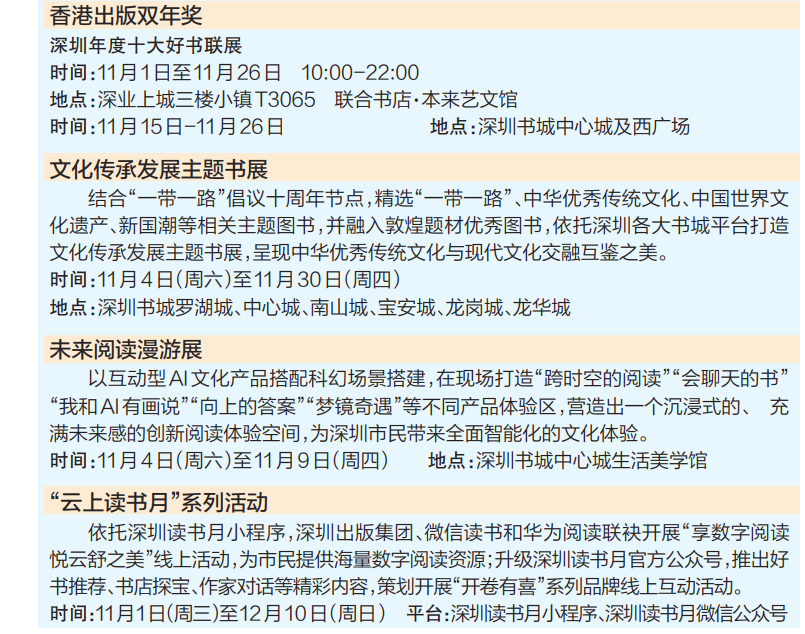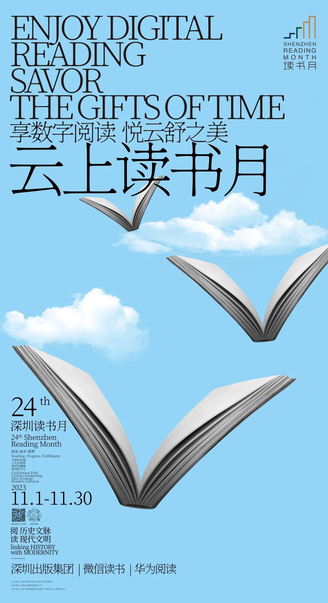 依托深圳读书月小程序,深圳出版集团、微信读书和华为阅读将联袂开展“云上读书月”系列活动,为市民提供海量免费数字阅读资源;深圳图书馆联合大湾区城市图书馆推出“书香湾区 触手可得”数字阅读创新推广系列活动,通过数字资源“共享”宣言、海量数字资源创新推广、市民信息素养提升行动、“网罗天地 融汇古今——网络文学IP展”、湾区“共读”、趣味猜书等方式,展现人文湾区“读书乐”的美丽画卷。此外,品读南山——2023“南山全民听书节”、“数字科技 创新阅读”主题系列活动和“阅见书香龙华”系列读书活动也将在11月陆续推出。