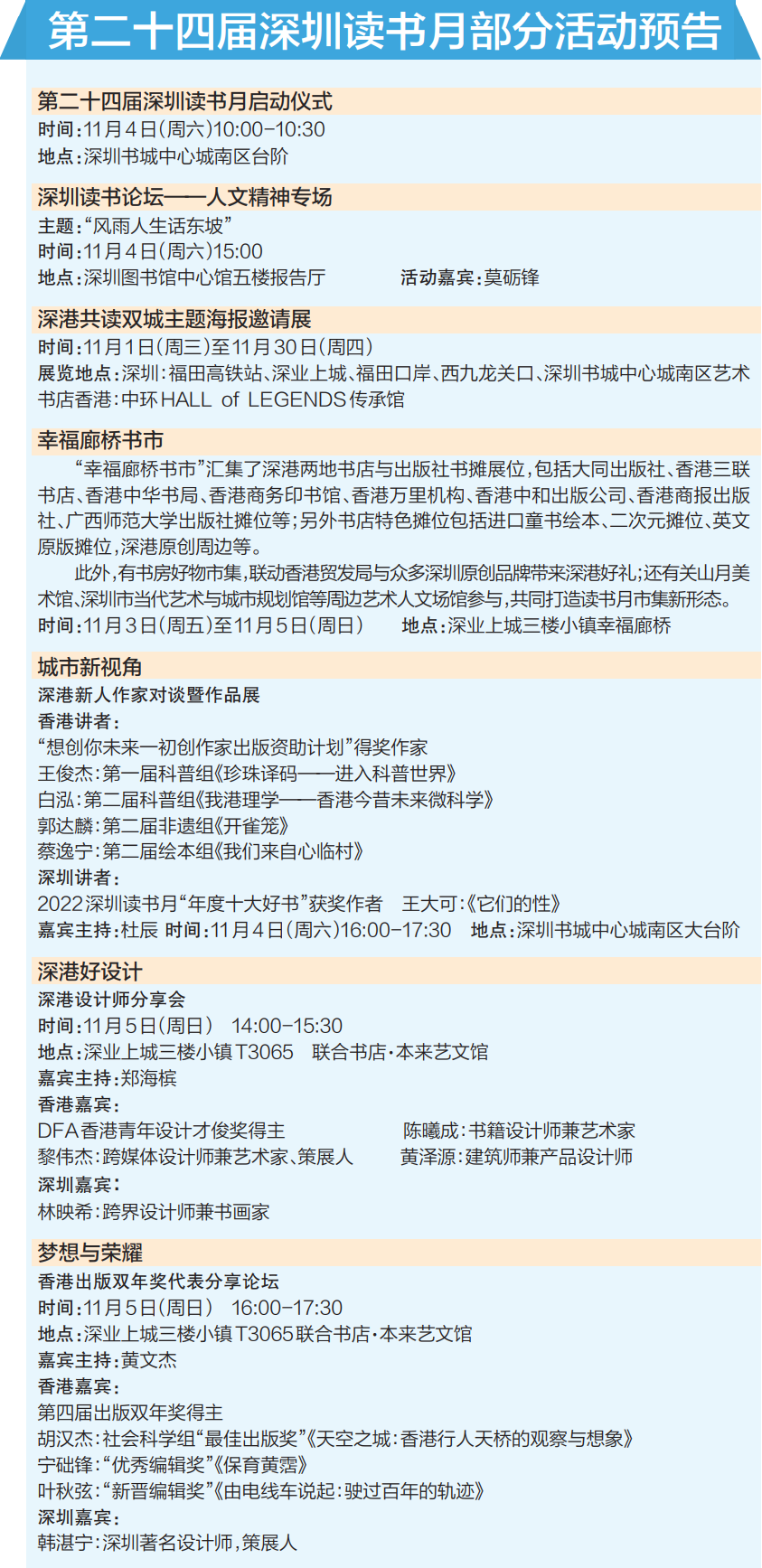 经济科技高度发达的地区,也是城市文明的兴盛之地。本届读书月以“共读双城”为主题,创新推出系列深港阅读交流活动。接下来,幸福廊桥书市、深港设计师对话、深港新人作家对谈暨作品展、深港青少年同诵古诗词展演活动、香港出版双年奖×深圳读书月年度十大好书联展等活动将轮番上演。