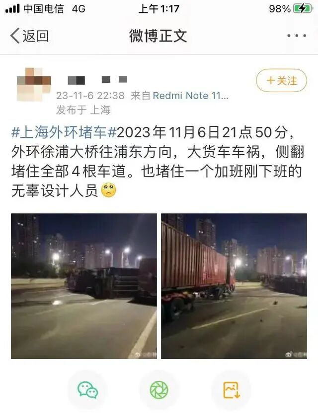 据澎湃新闻此前报道,11月6日夜间,有网友发布信息表示,外环徐浦大桥发生事故导致道路难以通行。