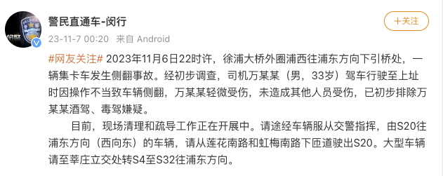 据上海市公安局闵行分局官方微博@警民直通车-闵行 11月7日凌晨通报:11月6日22时许,徐浦大桥外圈浦西往浦东方向下引桥处,一辆集卡车发生侧翻事故。经初步调查,司机万某某(男,33岁)驾车行驶至上址时因操作不当致车辆侧翻,万某某轻微受伤,未造成其他人员受伤,已初步排除万某某酒驾、毒驾嫌疑。