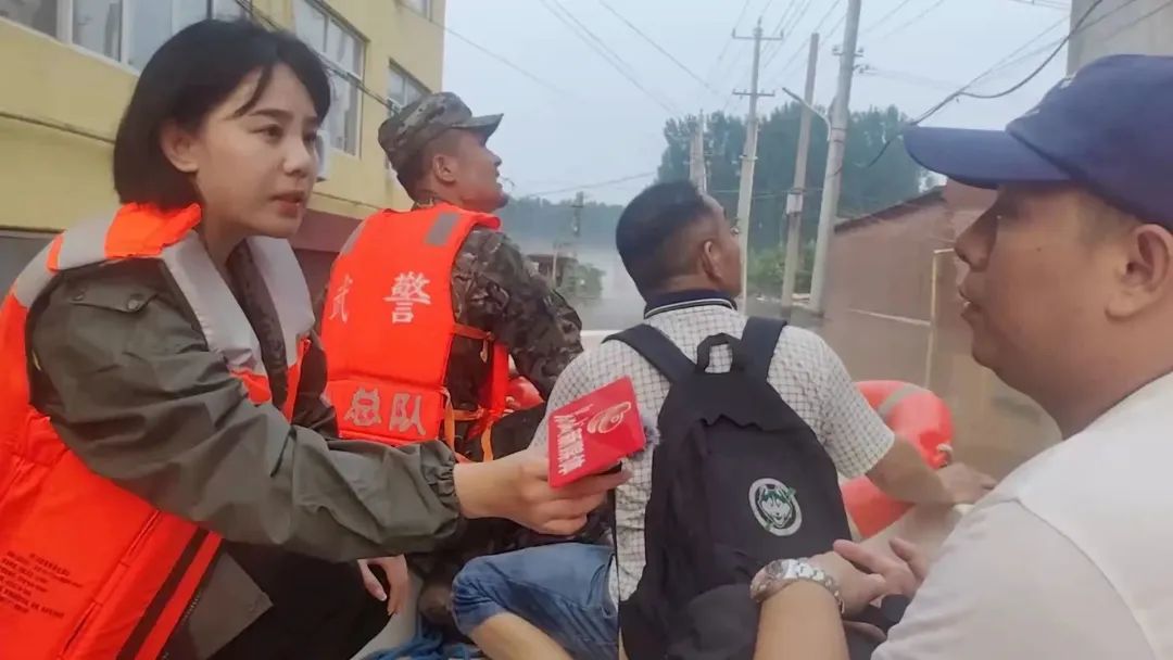 2023年8月2日,长城新媒体记者张谢雅(左一)跟随武警河北总队机动支队官兵乘坐冲锋舟,进入涿州市卢家场村展开救援采访。