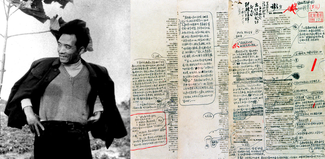 左图:焦裕禄资料照片。右图:新华社记者穆青、冯健、周原写的《县委书记的榜样——焦裕禄》原稿(资料照片)。新华社发