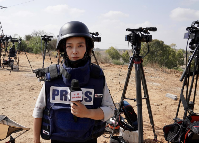 2023年10月24日,中央广播电视总台记者陈慧慧在距离加沙地带不到1公里的斯代罗特,进行直播报道。