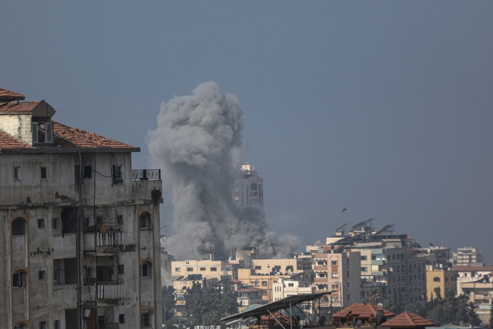 11月9日,加沙城建筑遭以色列军队空袭后升起浓烟。新华社发