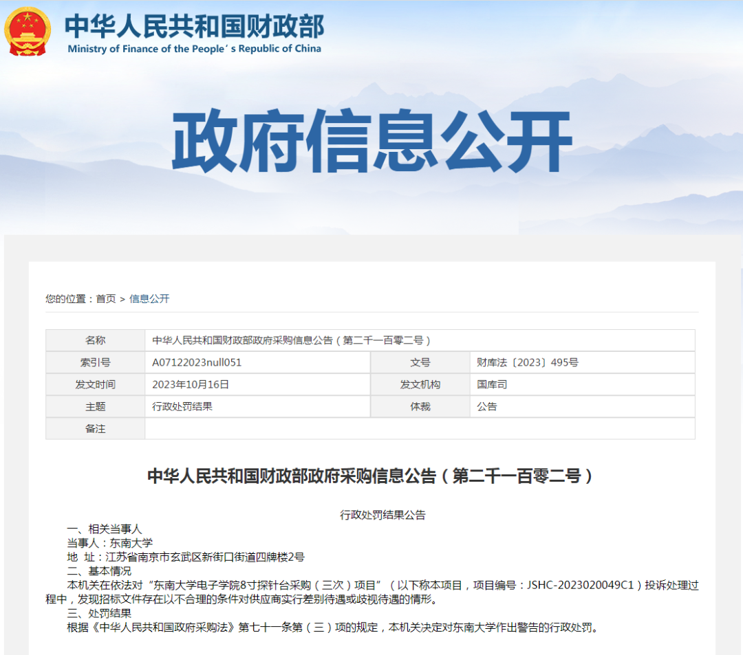 近日,“某大学被财政部通报”的消息冲上网络热搜。财政部披露的行政处罚结果公告显示,该知名大学在政府采购招标文件中,存在“以不合理的条件对供应商实行差别待遇或歧视待遇的情形”,受到警告的行政处罚。